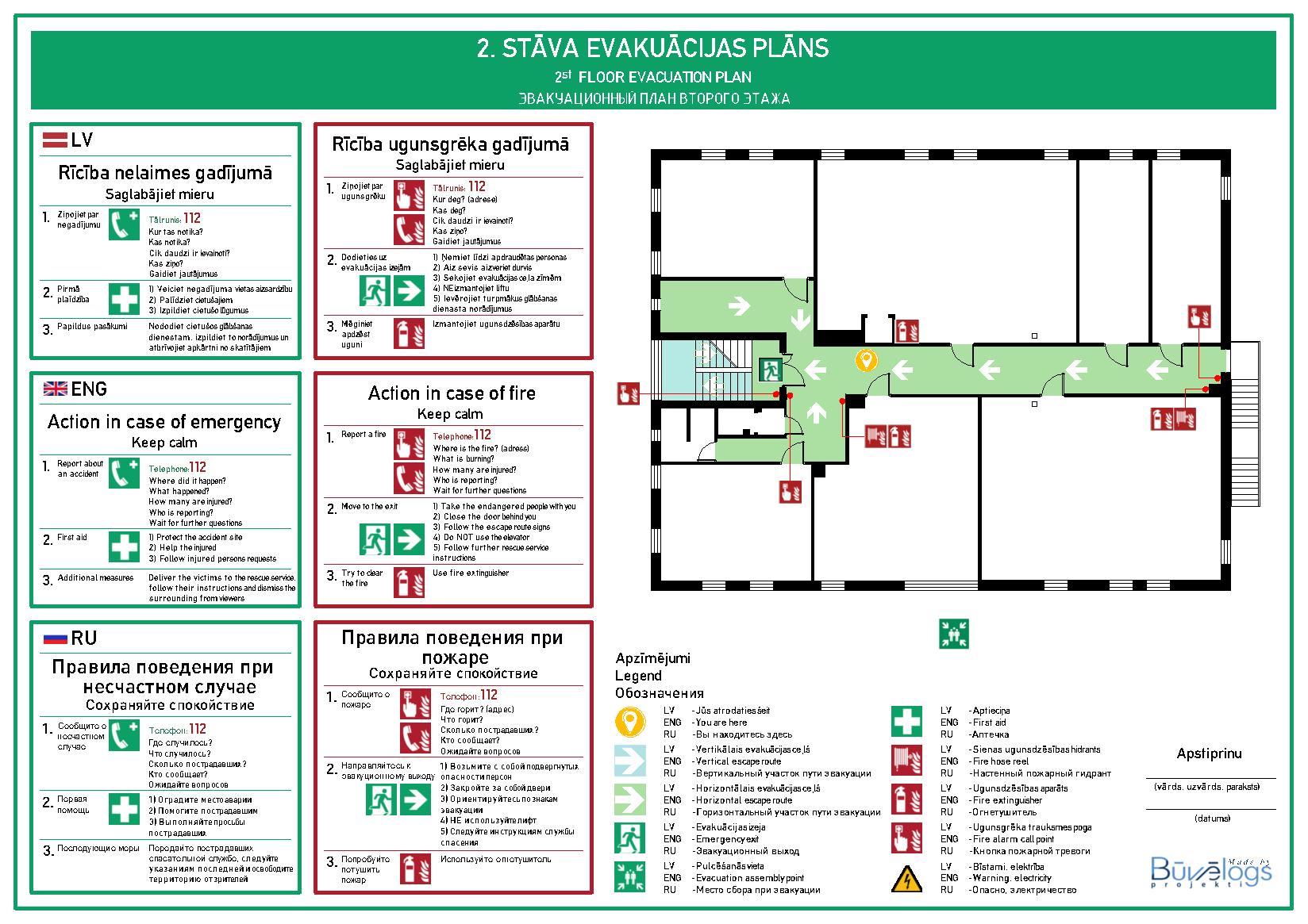 Evakuācijas plānu un inženierkomunikāciju apzīmējumu izstrādeEvakuācijas plānu izsgtrāde saskaņā ar LVS 446, ievērojot starptautisko praksi saskaņā ar ISO un DIN standartu prasībām. Inženierkomunikāciju izstrāde saskaņā ar EN un DIN standartu prasībām. Attiecīgo standartu ievērošana nodrošina strukturētu inženierkomunikāciju apzīmēšanu, evakuācijas plānu izstrādi vienotā dizainā, kvalitatīvi izceļot visu objektu kopumā. Papildus ir apzīmējami arī ugunsdzēsības hidranti, dūmu detektori, ugunsgrēka trauksmes pogas, evakuācijas izejas un ceļi, dūmu lūkas, tehniskās telpas. Vienotā rūpnieciskā dizaina nodrošināšana ir svarīgs kopējā kvalitatīva interjera nosacījumsm Jūsu Objektā.